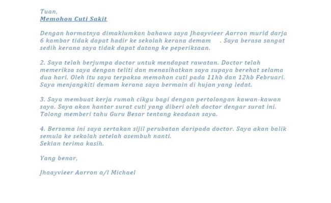 Surat Rasmi Memohon Cuti Sakit Sekolah